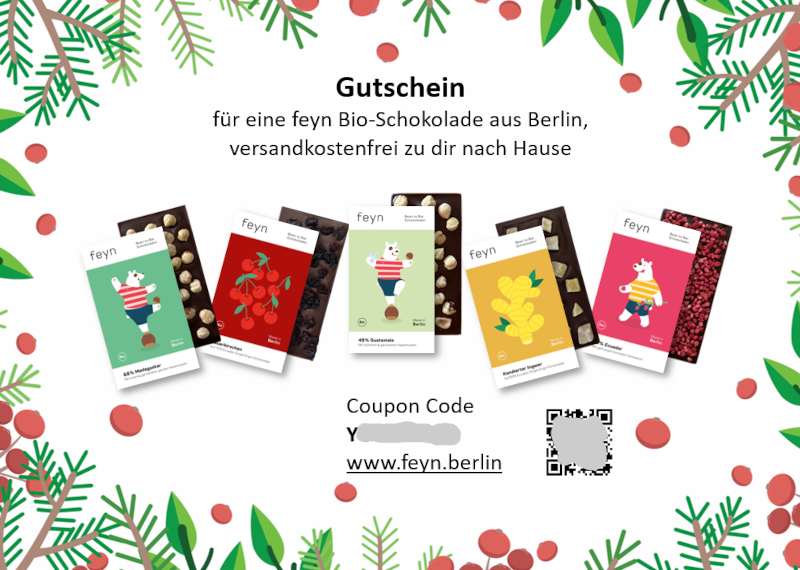 Gutscheinkarten auf festem Karton für den Postversand – die stilvolle Einladung, sich die Lieblingsschokolade selbst auszusuchen.